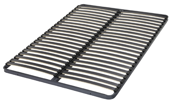 Cadre de lit métallique avec sommier à lattes. La structure est en métal cintré avec un cadre en tube rectangulaire et des angles arrondis. Il comprend un double axe central de renfort pour les doubles couchages. Le sommier est doté d'une peinture époxy moka pour une garantie anti-corrosion. La suspension se compose de 13 lattes larges décor multiplis bois Anti-Gliss, dont 9 lattes standard et 4 lattes spéciales "creux d'épaule", toutes avec des doubles rotules ergodynamiques polyéthylène clipsées. Des jeux de pieds sont disponibles en option.